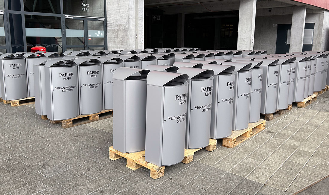 Wir beschrifteten über 200 Mülltonnen, welche nun in der MHP Arena Stuttgart verteilt werden.